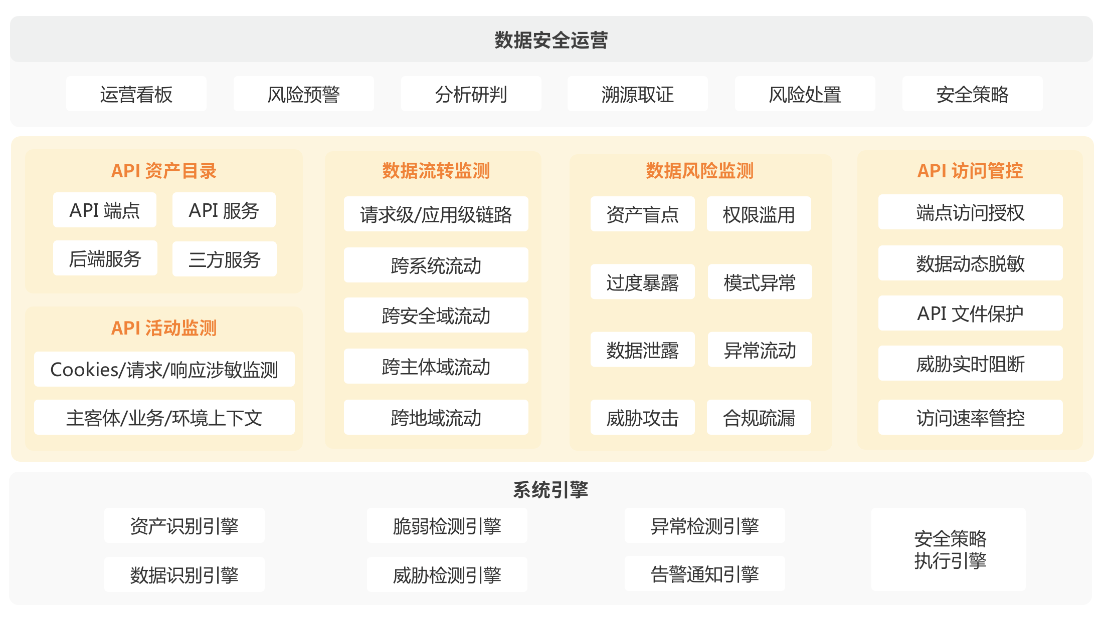 API 作为数据交互的核心通道,其调用过程中的数据流向往往缺乏透明化追踪。例如, 跨 API 交互的数据难以感知,敏感数据可能在共享后违规导出或二次封装,而泄密事件发生时无法明确泄露范围、时间和责任主体。此外,传统 API 资产识别及审计手段难以覆盖传输、访问和共享全链路,导致数据泄露或异常访问难以及时发现。